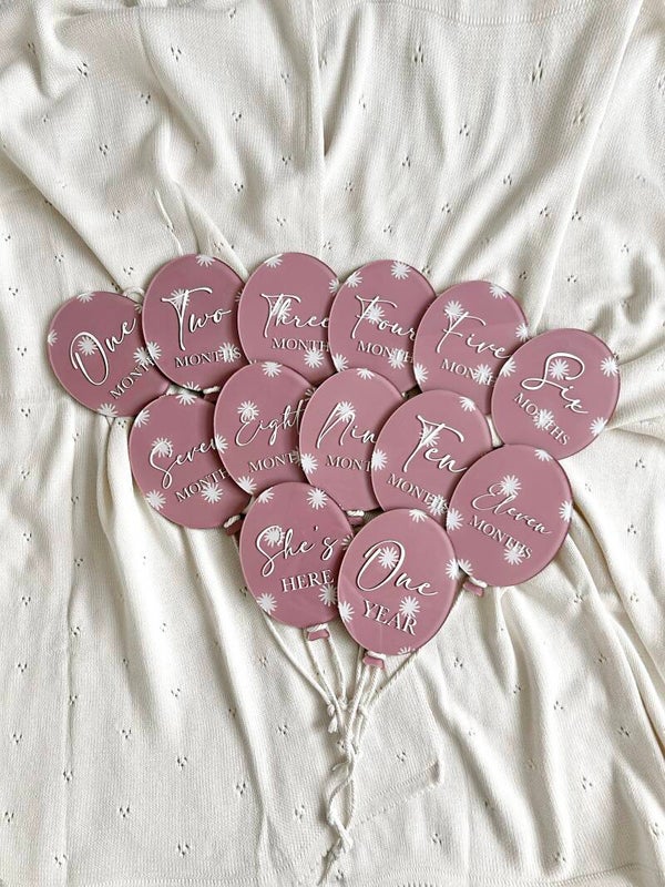 Daisy milestone set. Set of 13 balloons. Please allow 4-6weeks for delivery. Please also select background colour.