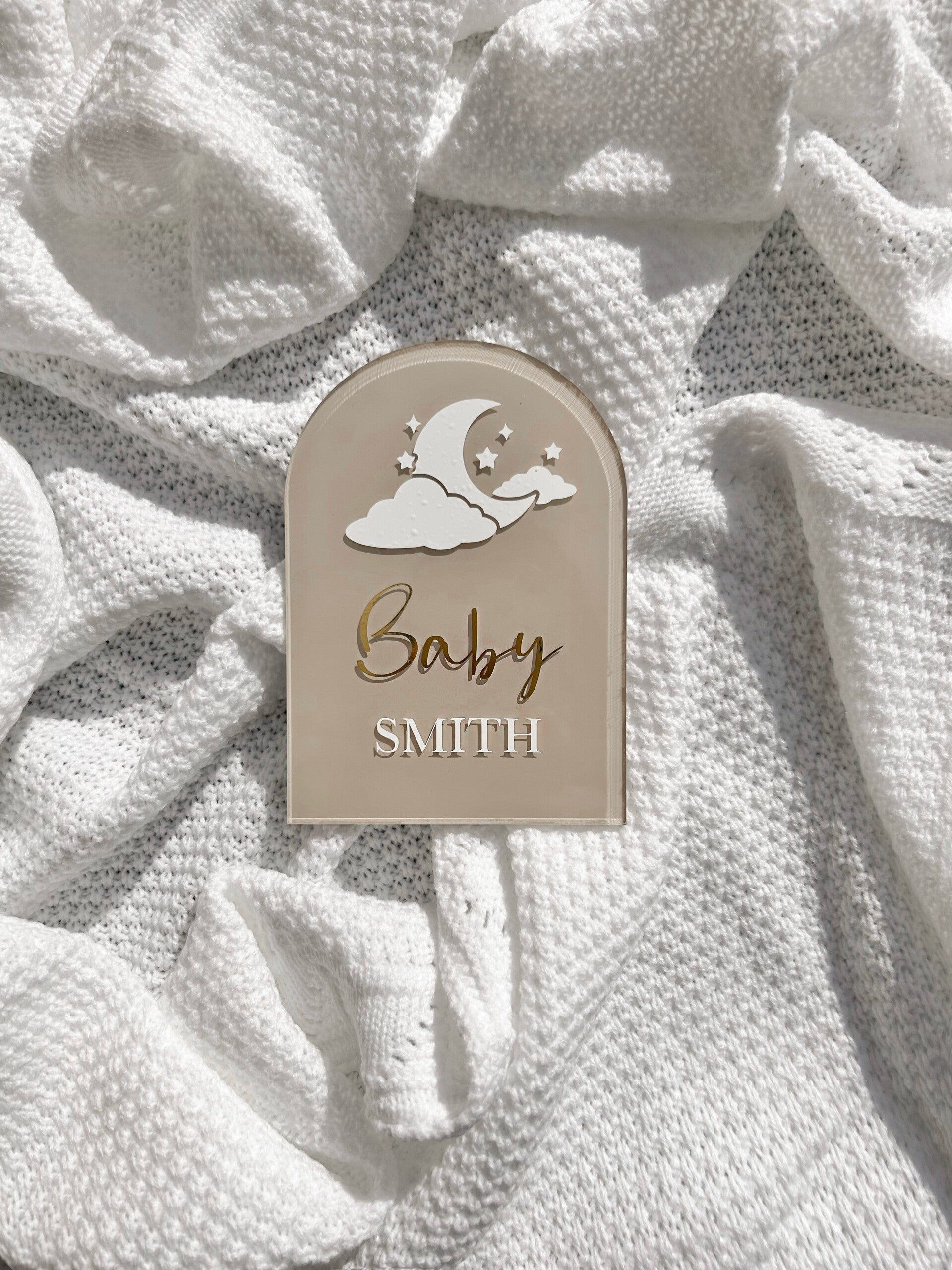 Moon and cloud boho arch plaque. The colour used here is dark beige. Please write the exact wording in the box with no more than 3 words.