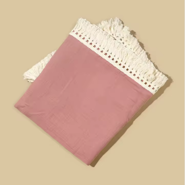 Swaddle your newborn in style with our fringe muslin blanket. Also makes as a lightweight summer blanket which can be used for yours on end! Size: 120cm*120cm