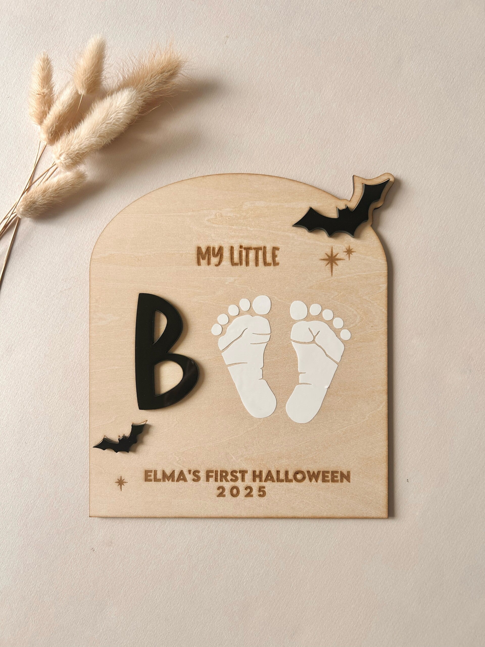 Celebrate your little one’s first Halloween with this adorable “My Little Boo” wooden plaque – the perfect keepsake to treasure forever! Featuring engraved lettering, a spooky bat design, and space for your baby’s footprints, this sign makes a fun and memorable Halloween craft.