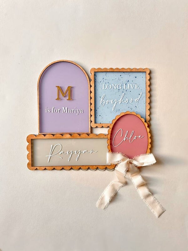 Featuring a raised initial and personalised name, this sign makes a thoughtful gift for newborns, birthdays, or special celebrations. The background colour can be fully customised to match your décor or theme, ensuring a perfectly tailored finish.