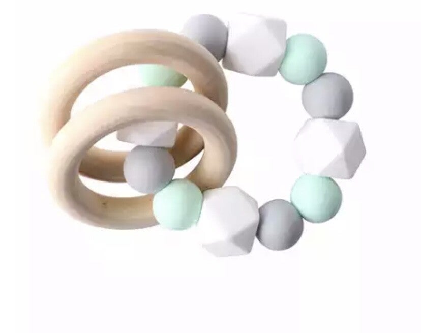 Mint, grey and white silicone and wooden ring teether