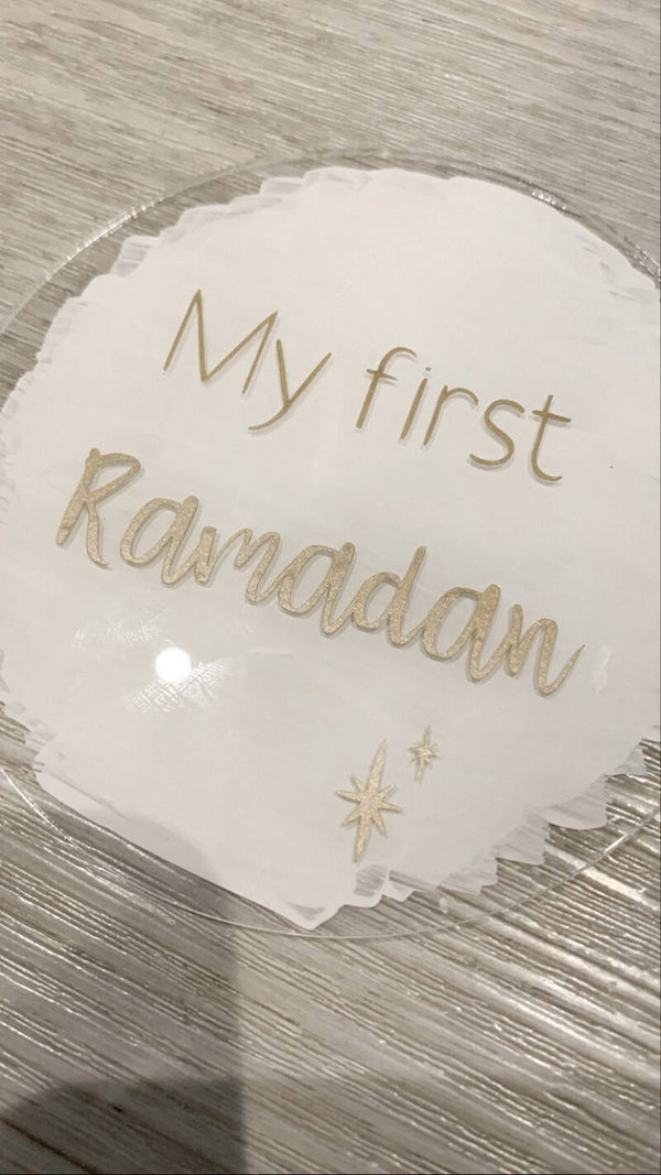 White background with gold writing.We can add a name eg 'Mariam's first Ramadan' if you require this please put it in the notes section at checkout