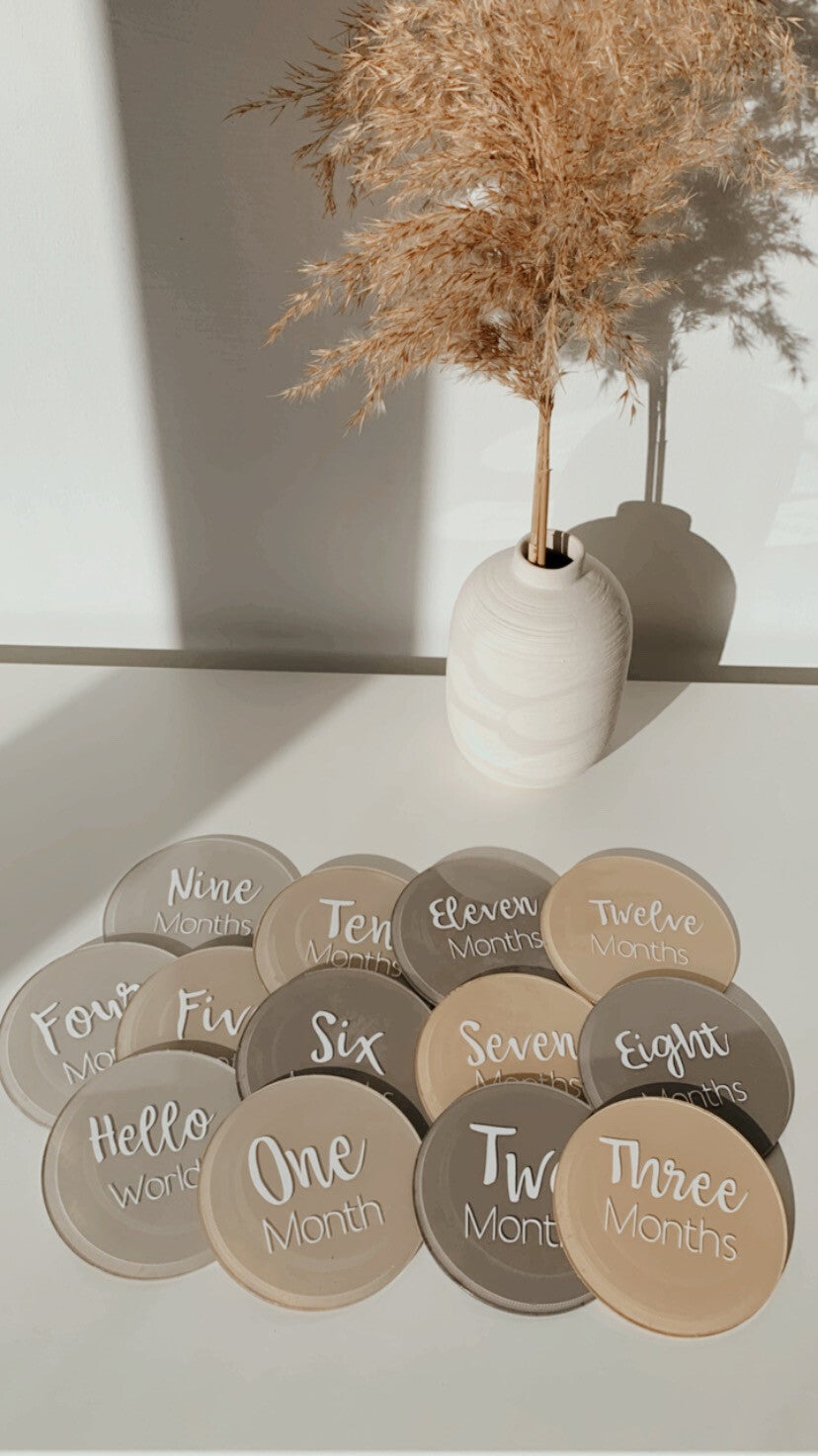 Neutral monthly milestone plaques. Include hello world disk and months 1-12.