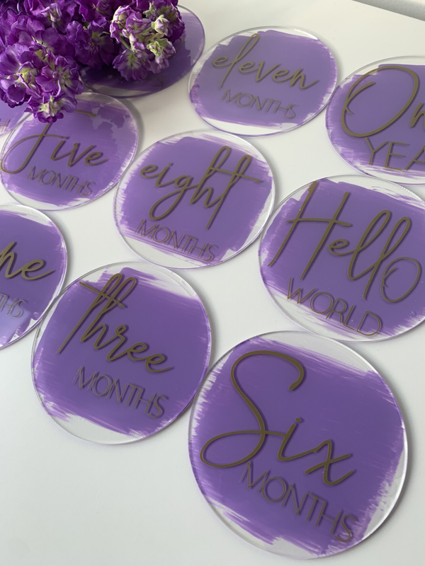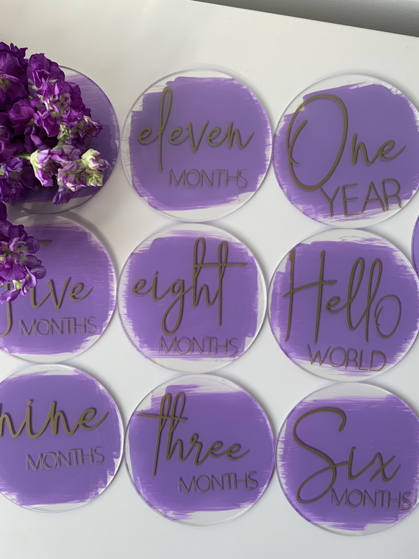 Lilac with gold font month by month milestone plaques.