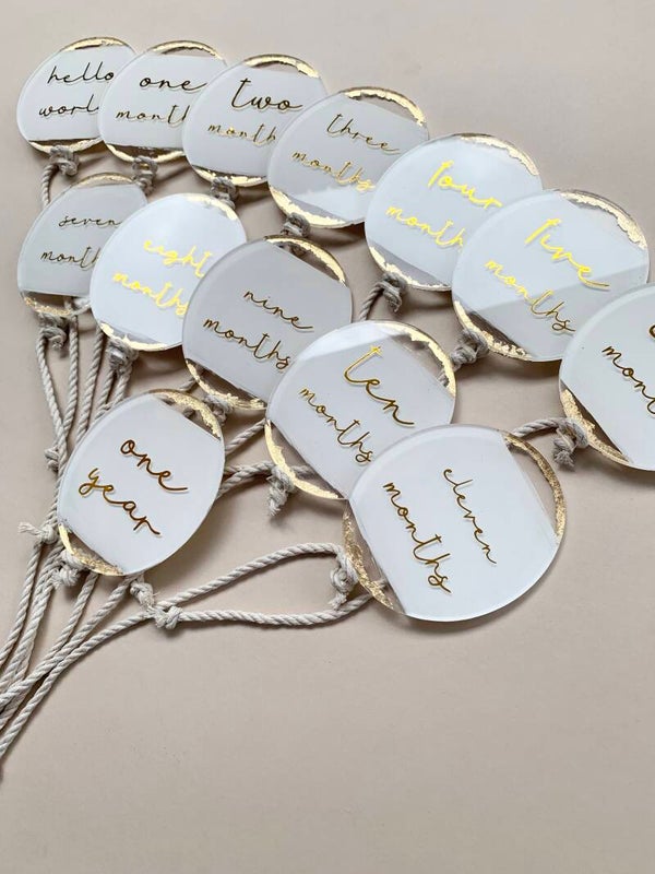 Acrylic balloon set. Includes hello world, one-11 months and one year.