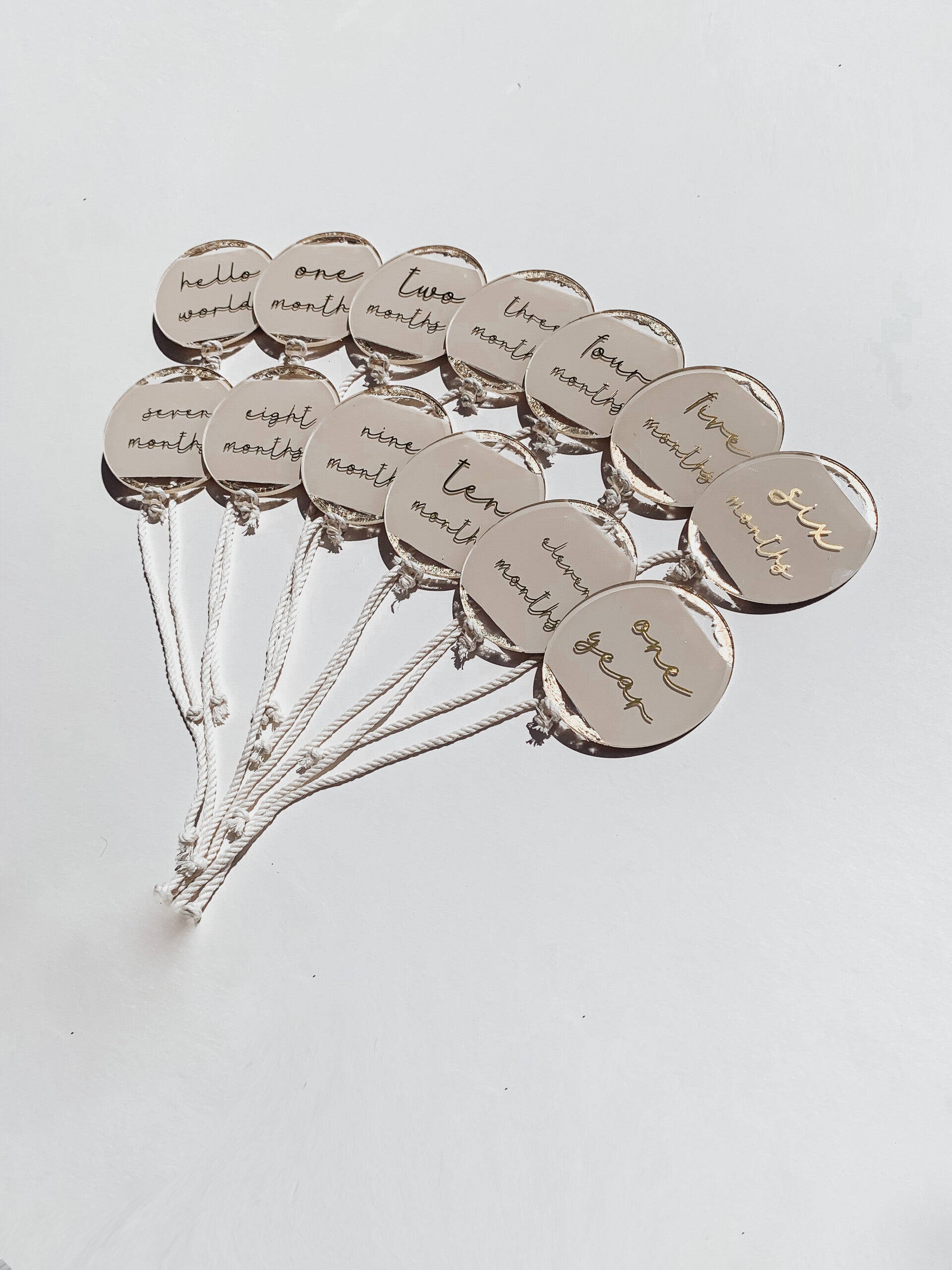Acrylic balloon set in the colour string. Includes hello world, one-11 months and one year.